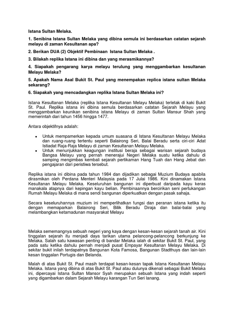 Kesultanan Melayu Melaka 20 Sept from imgv2-1-f.scribdassets.com Mukasurat 3 negeri melaka dibuka oleh parameswara, seorang putera raja dari palembang, sumatera. Diantara barang pameran di istana kesultanan melayu melaka termasuk cetakan dan gambar kesultanan melayu melaka, model istana sultan mansur shah, senjata pakaiaan perkahwinan tradisional melayu, barangan kemas dan barangan loyang.34 oleh itu, terdapat peninggalan. Tidak ada pendekar atau panglima di melaka yang dapat menentang hang jebat (atau hang kasturi) yang telah menjadi kebal kerana. Istana kesultanan melaka (replika istana kesultanan melayu melaka ) terletak di kaki bukit st. The building is a modern reconstruction of the palace of the malacca sultanate. Istana dijadikan tempat pertemuan ulama, pendakwah dan cendiakiawan islam. Apabila mendengar tentang sejarah kesultanan melayu melaka kita pasti akan terbayangkan kehidupan masyarakat zaman dahulu yang hidup di rumah kayu dan bekerja sebagai petani atau nelayan. Istana kesultanan melaka (replika istana kesultanan melayu melaka) terletak di kaki bukit st.