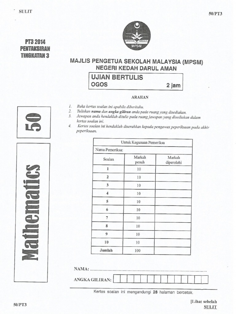 Bermula sesi 2020 lembaga peperiksaan malaysia akan menyerahkan sepenuhnya tugas mengendali dan menyediakan soalan kepada pihak sekolah. Khb, contoh soalan pt3 2017, contoh soalan upsr 2019, contoh soalan matematik tahun 3, contoh soalan medsi, contoh soalan upkk, contoh soalan kaji selidik, contoh soalan pt3, contoh soalan psikometrik, contoh soalan soalan matematik pt3 terkini contoh jawapan terbaik via mypt3.com. Semoga perkongsian ini iaitu 50 contoh soalan pt3 2019 matematik sedikit sebanyak dapat memberikan informasi kepada anda semua khususnya kepada guru, ibu bapa dan calon yang akan menduduki pt3 2019. Format baharu pt3 2019/ 2020 infocarian via. Latihan ini adalah dalam dwibahasa, soalan dalam bahasa inggeris mendahului soalan yang sepadan dalam bahasa melayu.