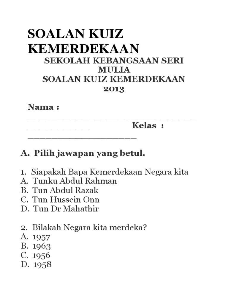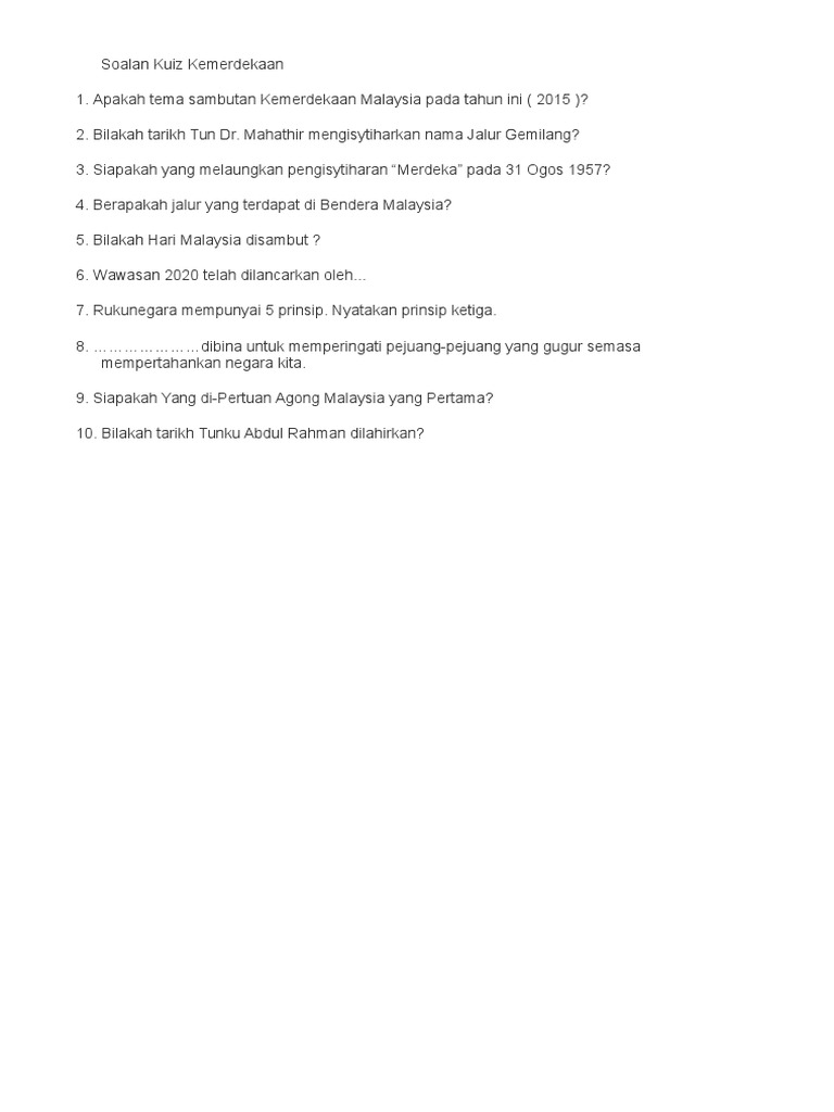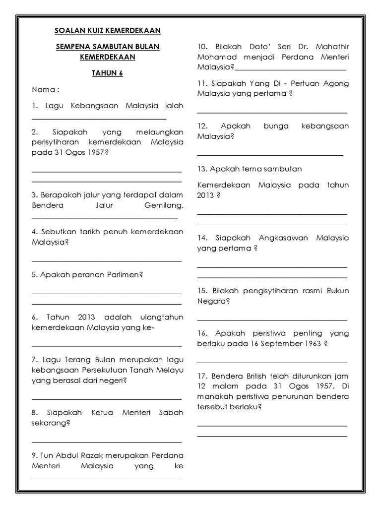 Bilakah sambutan hari kemerdekaan yang diadakan setiap tahun ? Tahun ini merupakah tahun kemerdekaan malaysia yang ke……. Penafian hospital tuanku ja'afar seremban (htjs) tidak akan bertanggungjawab ke atas sebarang kehilangan atau kerosakan yang diakibatkan oleh penggunaan maklumat yang dicapai. Contoh soalan kuiz kemerdekaan sekolah rendah himpunan terbesar kuiz kemerdekaan yang penting dan boleh di download dengan mudah cikgu ayu 64741727 soalan kuiz kenegaraan merdeka 1 Sejarah malaysia soalan 1 pada 20 januari 1874 satu perjanjian telah ditandatangani dan ia telah menjadi titik tolak kepada peluasan jajahan british ke atas tanah melayu.