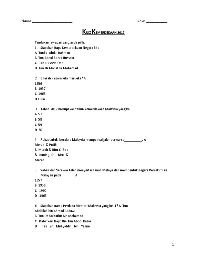 Soalan Kuiz Kemerdekaan 2018 / Himpunan Terbesar Kuiz Hari Merdeka Yang Meletup Dan Boleh Di Cetakkan Dengan Cepat Pendidikan Abad Ke 21 : A) bunga ros b) bunga mawar c) bunga raya d) bunga matahari 2) siapakah yang mencipta bendera malaysia?
